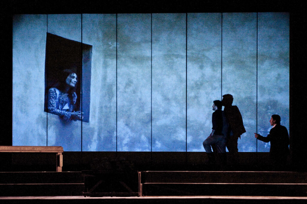 Ed è proprio per sottolineare da una parte l’atmosfera fantastica della vicenda e dall’altra l’estrema modernità del testo che nella messa in scena ho scelto di utilizzare insieme al linguaggio proprio del teatro, anche quello cinematografico: molte scene dello spettacolo, infatti, avvengono dentro un film appositamente realizzato e la stessa ambientazione scenografica, utilizza proiezioni di grandi immagini come fondali davanti ai quali agiscono i protagonisti dello spettacolo.